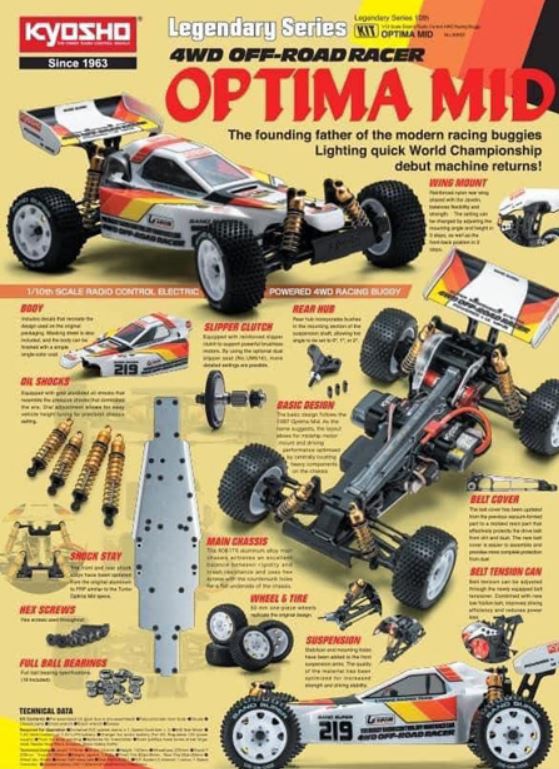 Kyosho 1/10 Optima MID 4WD Racing Buggy EP。Optima Mid 於1987年英格蘭第二屆世界電動越野汽車錦標賽上的出色亮相,該原型車在 A-Main 決賽的 10 位中佔據了 5 位,並獲得第二名。Optima 帶有中置馬達配置和雙搖臂懸架的佈局越來越受歡迎,並成為現代四驅電越野車的佈局基礎。主底盤採用6016T6鋁合金以確保高剛性。每個部件都經過重新設計更新以匹配現代動力系統,例如提高效率和精確齒輪比設置的 48P齒輪。並且皮帶傳動系統還具有可調節皮帶張力的特點,實現平穩效率的驅動,此外,例如 FRP 前後避震器支架,以及沉頭螺絲孔主底盤也被納入。原汁原味的 Optima Mid 車殼設計的忠實再現了流行的復古風味,請您一起體驗 Optima Mid 無法比擬的操控感受